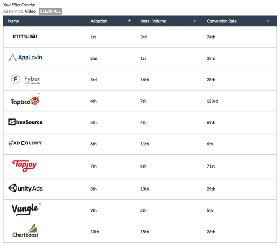 First up in the series are advertising partners for the search criteria of video. You’d use this criteria if you want to attract users to your app with video ads, and want to know which partners other marketers use the most. The Mobile Advertising Index filters more than 1,000 advertising networks and publishers, so you know you’re truly getting an accurate picture of the top players in the space. Here are the top 10 advertising partners that TUNE customers use most for video ads: