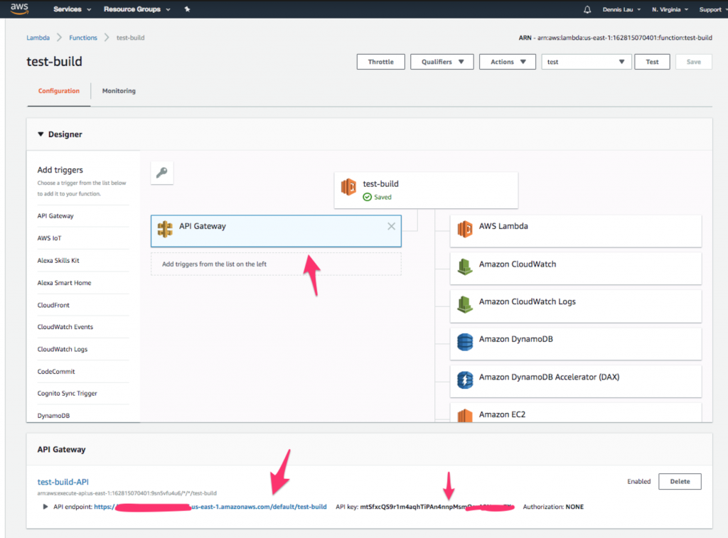 - Once the Dynamo table is created, let’s make a call to this Lambda function from a public URL. Go back to your function and click the “API Gateway” icon at the top. You should see that the endpoint and API key have already been created for you.